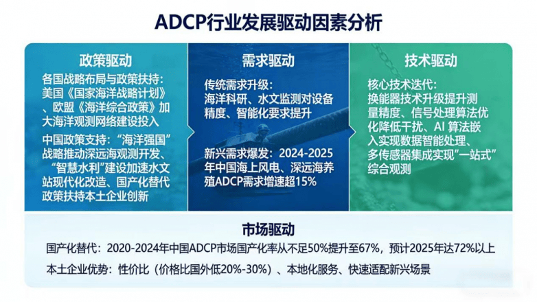 ADCP行业发展由政策、需求、技术、市场四大因素协同驱动,政策与需求为核心驱动力,技术为关键支撑,市场竞争与国产化替代为重要助推力。