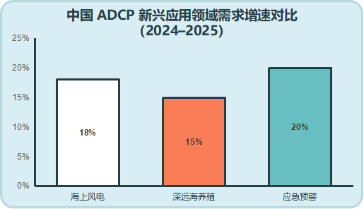 ADCP应用从传统场景延伸至海上风电、深远海养殖、海底电缆监测等新兴领域。2024年中国海上风电新增装机超10GW,带动ADCP需求同比增长18%;深远海养殖需求增速超15%;应急预警领域2025年需求增速预计超20%,新兴领域成为增长核心。